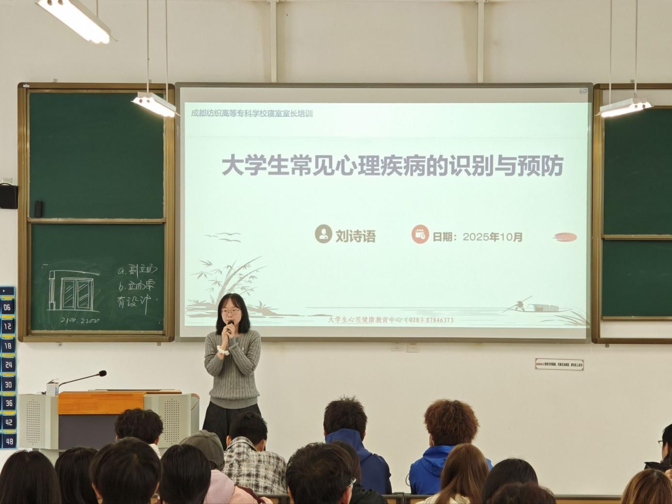 会上,刘诗语以“大学生常见心理疾病的识别与预防”为主题做讲座。结合典型案例,刘诗语细致讲解了抑郁症、精神分裂症等心理疾病的症状表现,分享了实用的心理危机预防与干预技巧,指导寝室长如何以温暖、恰当的方式给予室友心理支持,营造积极健康的寝室氛围。同时,刘老师还向同学们分享了校心理健康中心的电话、心理咨询预约二维码及心理危机干预援助热线,引导大家善用专业支持,构筑“助人助己”的心理防线。