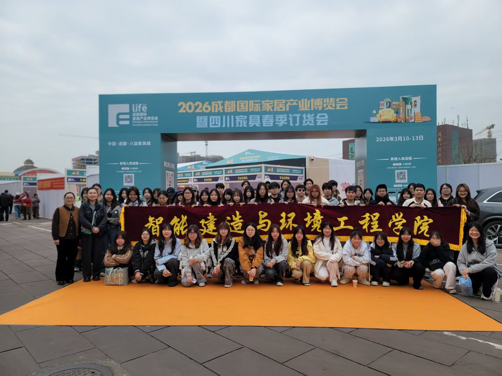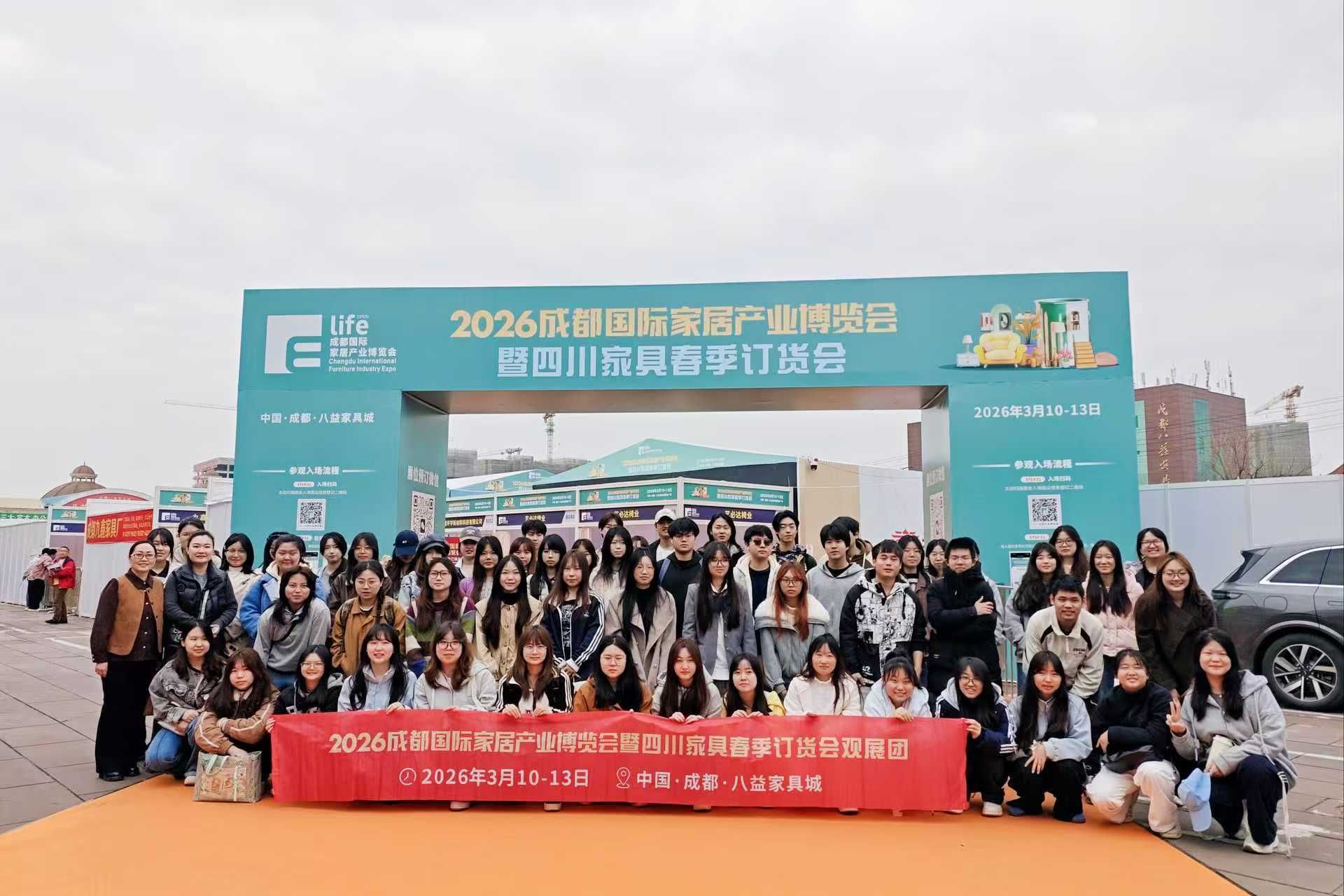 应四川省家俱行业商会邀请,3月10日,智能建造与环境工程学院文潜、卢若薇两位老师带领环艺241、环艺251两个班级学生,赴成都八益家具城参加2026成都国际家居产业博览会暨四川家具春季订货会。作为全国家具行业开年“第一展”,本次展会为专业学子搭建了近距离接触行业前沿、对接优质资源、践行设计理念的宝贵实践平台。