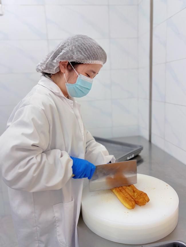 活动现场,后勤厨师全程负责和面醒发、下锅翻炸、控油装盘等核心操作,专业的手法、规范有序的流程尽显职业素养;学生志愿者则分工协作,高效完成切油条、转运油条、分发油条等辅助工作,顺利推进活动全程。