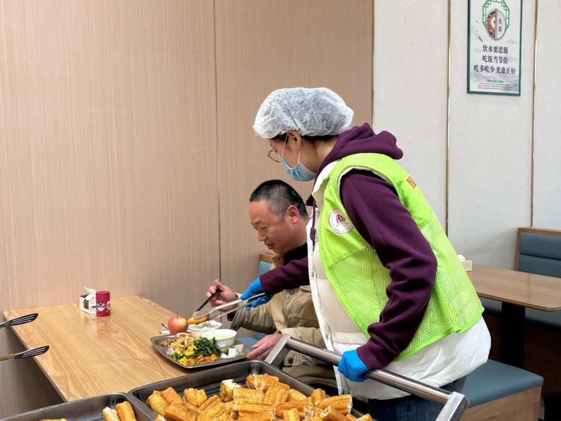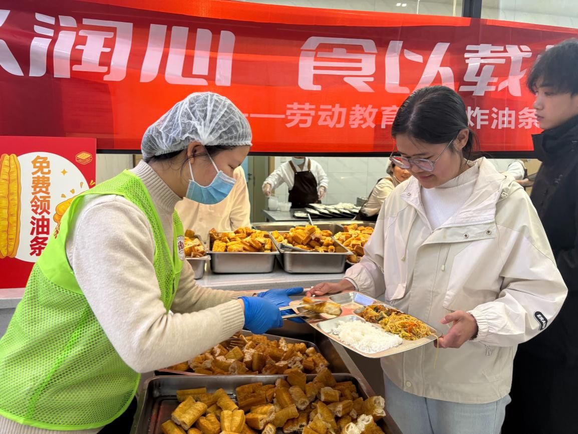 午间用餐时段,食堂“劳动教育成果分享窗口”前排起长队,志愿者们有条不紊地分发刚出锅的油条,师生们品尝着口感酥脆的油条,脸上均洋溢着喜悦之情。