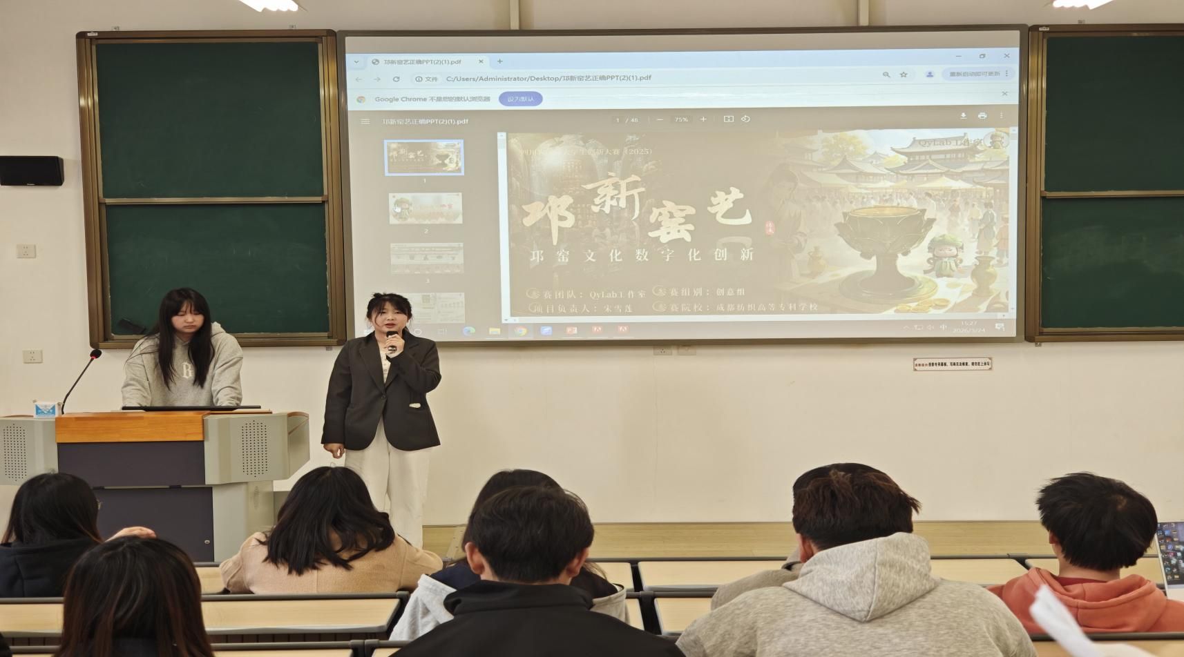 比赛现场,各参赛团队精神饱满、准备充分。邛新窑艺团队作为首支登场队伍,凭借制作精美的PPT演示和流畅清晰的现场演讲,深刻阐述了项目核心内容与创新思路,充分彰显了团队的专业素养和良好风貌,为整场比赛拉开精彩序幕。