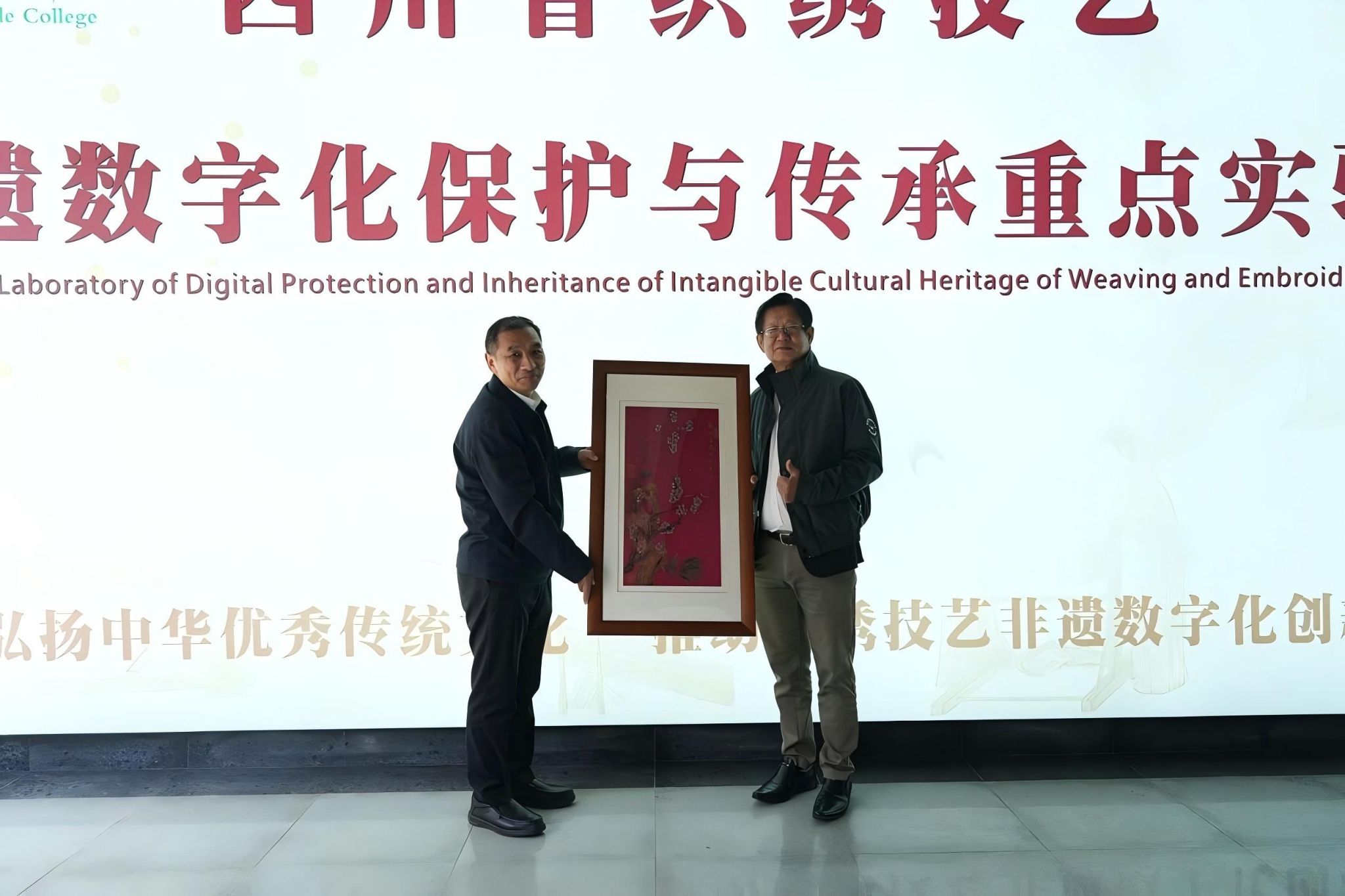 会后,代表团一行参观了我校四川省织绣技艺非遗数字化保护与传承重点实验室,实地感受我校在非遗数字化保护、织绣技艺传承与现代职业教育融合发展的成果。孙锐代表学校向来访嘉宾赠送蜀锦《梅开五福竹报平安》,以非遗文化为纽带,增进两校友谊。